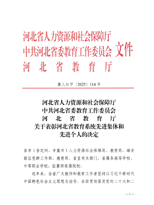 近日,河北省人力资源和社会保障厅、河北省教育厅印发了《关于表彰河北省教育系统先进集体和先进工作者的决定》,对一批在全省教育事业改革和发展中取得显著成绩的先进集体和先进个人进行了表彰。 博野中学荣获“河北省教育系统先进集体”。