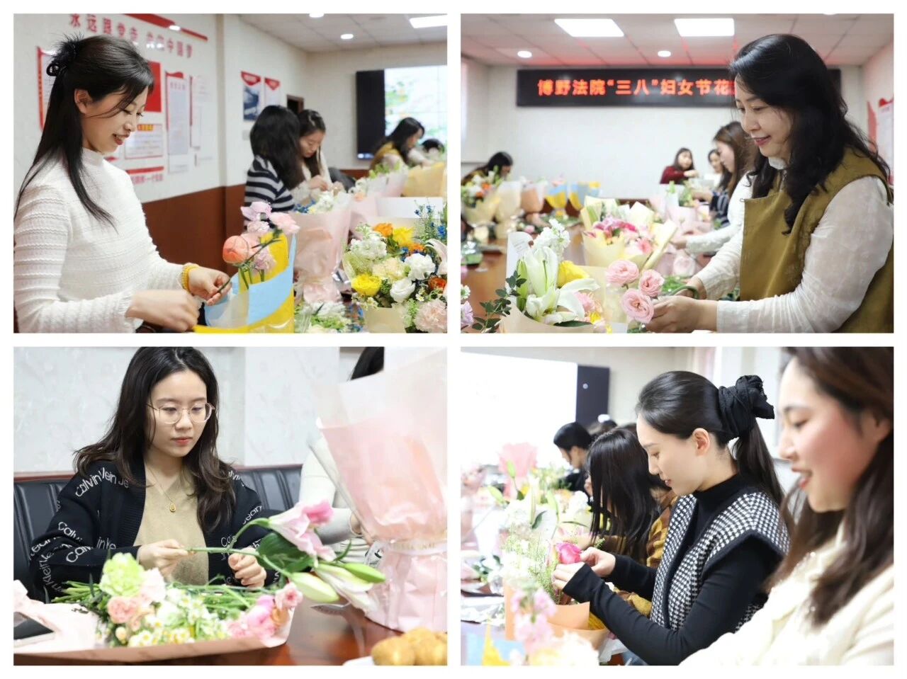 春风送暖,芳华正好。为庆祝第116个“三八”国际劳动妇女节,丰富女干警精神文化生活,展现新时代法院巾帼风采,3月5日,博野法院组织开展花艺沙龙活动,全体女干警欢聚一堂,以花为媒、以艺润心,共赴一场春日美学之约。 活动开始前,县法院党组成员、政治部主任张丽颖代表院党组向全体女干警致以节日的问候和真诚的祝福,充分肯定女干警在审判执行、诉讼服务、综合管理等岗位上恪尽职守、担当作为,以柔肩扛起正义天平,用坚守诠释法治初心,是法院高质量发展不可或缺的“半边天”力量。