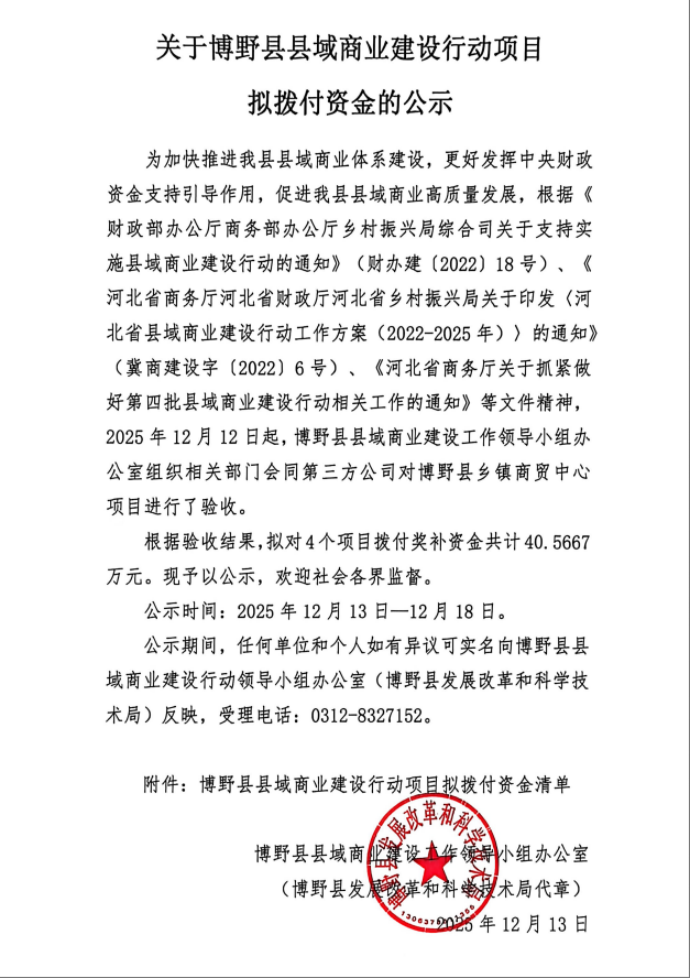 关于博野县县域商业建设行动项目拟拨付资金的公示
