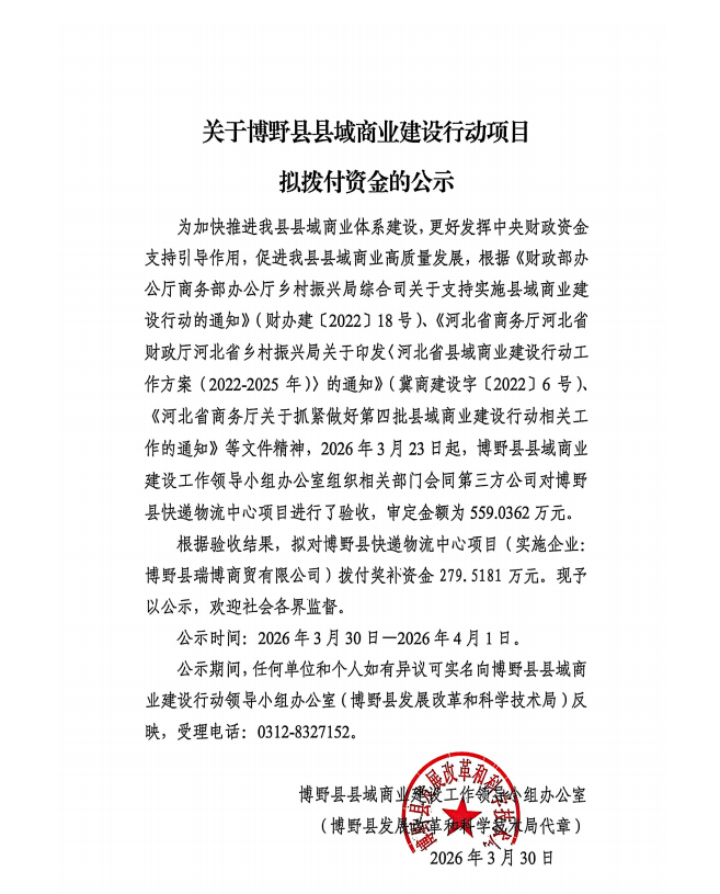 关于博野县县域商业建设行动项目拟拨付资金的公示