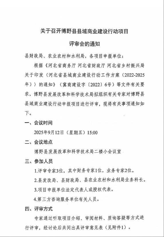 《关于召开博野县县域商业建设行动项目评审会的通知》