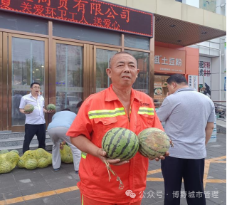 活动中发放矿泉水50件、西瓜1000斤等慰问品,以此感谢他们长期以来为城市环境卫生付出的辛勤劳作,为高温下坚守岗位、任劳任怨的城市“美容师”送上一份关爱。