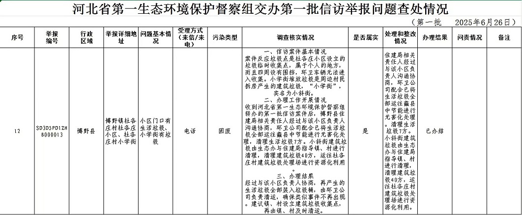 河北省第一生态环境保护督察组交办第一批信访举报问题查处情况